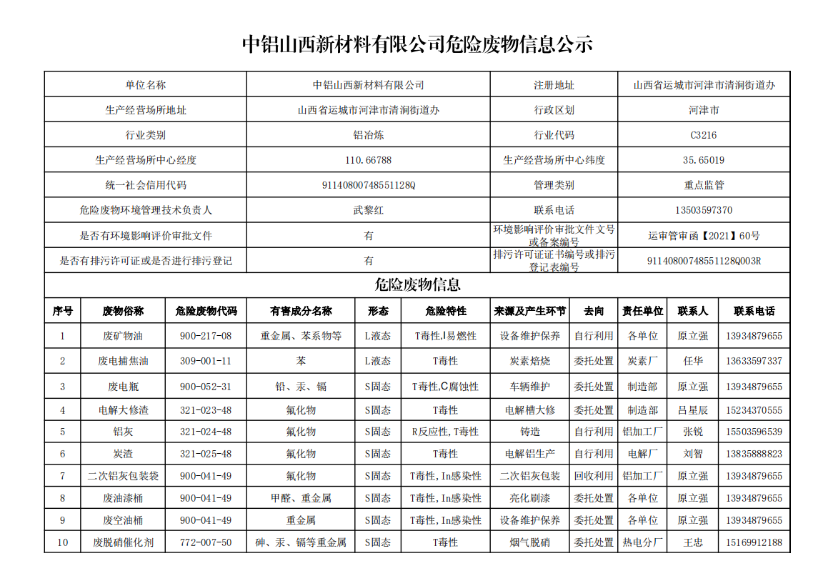 中鋁山西新材料有限公司危險(xiǎn)廢物信息公示